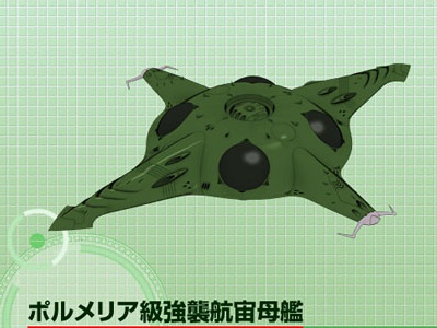 The Polmeria-class carrier is 383.8 meters long, 291.3 meters wide, and 50 meters in height. It has three twin missile launchers and a large caliber laser cannon on the ventral side. Polmeria class ships carry DWG229 Melanca strike fighters and FG.156 Sumaruhe reconnaissance aircraft.