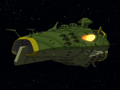The Meltoria-class is the largest type of the second-class[6] space armored vessels. It is highly maneuverable and heavily armed with several triple positron beam turrets and torpedo tubes. It is equipped with tractor beams.[8] At least one DWG262 Czvarke astro combat fighter can be stored in a hangar located under the third dorsal turret. It is classified as "battle cruiser" on the earth's side. Analyzer identified the Meltoria-class as L-class cruiser.