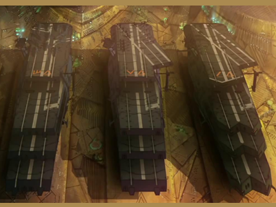 The Super Gelvades-class was prototyped for long-distance transport of goods and personnel. The appearance of the Gelvades-class space battle carrier was used as a reference for its design, but it has no direct relation to the space battle carrier development plan advanced by Garmillas's Weapons Development Agency.