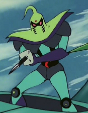 The Saucer Beasts are the main military weapons of the Vegan Empire in a manner very similar to the Mechanical Beasts of Dr. Hell. They are constructed by Vegatron and powered by the radiation the ore gives off. As the name suggest they initially appear as flying saucers and can switch between their fighting and vehicle forms. Some Saucer Beasts are piloted by soldiers or higher ranked military staff, while others are controlled by implanted brains of the denizens of Planet Fleed in their frames as told by Naida.