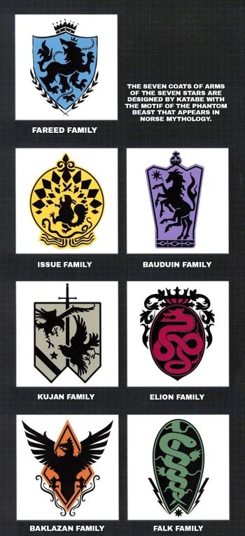The Seven Stars (セブンスターズ Sebun Sutāzu?) is a group of seven family clans that have managed Gjallarhorn for years. A family's rank within the Seven Stars is closely related to the "Order of the Seven Stars", a medal given to those who defeated a Mobile Armor.[2] Interestingly, the family of the famous Calamity War mobile suit pilot and one of Gjallarhorn's founder, Agnika Kaieru, is not in the Seven Stars.[2] It has been suggested that this was because all members of the Kaieru family died during the Calamity War, or that the war caused irreparable damage to the family.[2] The top-ranked families in the Seven Stars were believed to be second only to Agnika during the war, and they maintained their influence even after 300 years have passed since the end of the war.[2] | The Seven Stars (セブンスターズ Sebun Sutāzu?) is a group of seven family clans that have managed Gjallarhorn for years. A family's rank within the Seven Stars is closely related to the "Order of the Seven Stars", a medal given to those who defeated a Mobile Armor.[2] Interestingly, the family of the famous Calamity War mobile suit pilot and one of Gjallarhorn's founder, Agnika Kaieru, is not in the Seven Stars.[2] It has been suggested that this was because all members of the Kaieru family died during the Calamity War, or that the war caused irreparable damage to the family.[2] The top-ranked families in the Seven Stars were believed to be second only to Agnika during the war, and they maintained their influence even after 300 years have passed since the end of the war.[2] | ||