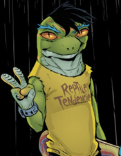 The Punk Frogs are a mixture of envy and innate violence. Frogs are natural hunters and predators, with a high level of aggression, and these happen to have the mental and physical age of rebellious adolescents. Though not combat-enhanced, they are still aggressive, and are what one could consider the 'bad guys' in Mutant Town. They are known to cause trouble, ranging from harassment to occasional fights breaking out, and they style themselves after aggressive punks and violent, rebellious youth. They are, however, aware there's only so much they can do before confronting the militia, and aware they can't leave the town. However, they are known to flee at night and go cause trouble in nearby towns. The town, for their part, is worried they'll bring law enforcement or anti-mutant activists to Mutant Town, and as such the group is at odds with the other citizens. They are also likely responsible for bringing illegal substances like bootleg alcohol and drugs in town, yet another reason why the population is worried.